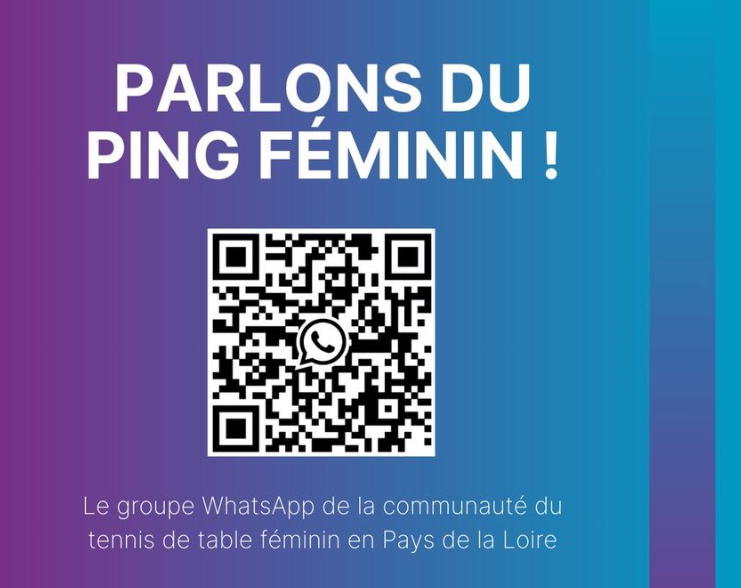 Mesdames, mesdemoiselles, passionnées de tennis de table, nous avons le plaisir de vous annoncer la création d'un 𝗴𝗿𝗼𝘂𝗽𝗲 𝗪𝗵𝗮𝘁𝘀𝗔𝗽𝗽 dédié aux pongistes des Pays de la Loire pour y 𝗿𝗲𝗹𝗮𝘆𝗲𝗿 𝗱𝗲𝘀 𝗶𝗻𝗳𝗼𝗿𝗺𝗮𝘁𝗶𝗼𝗻𝘀 𝘀𝘂𝗿 𝗹𝗲 𝗽𝗶𝗻𝗴 𝗮𝘂 𝗳𝗲́𝗺𝗶𝗻𝗶𝗻.
